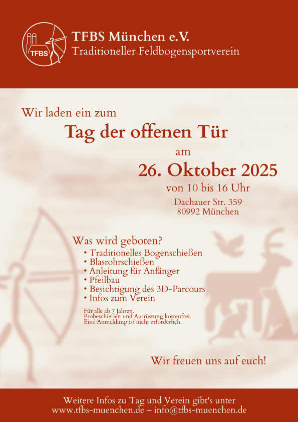 Hiermit laden wir Sie herzlich ein, an unserem Tag der offenen Tür, traditionelles Bogenschießen und Blasrohrschießen auf unseren Einschussbereichen auszuprobieren, sich unseren 3D-Parcours anzuschauen, dem Pfeilbau zuzusehen oder selbst mitzumachen und unseren Verein kennenzulernen.
